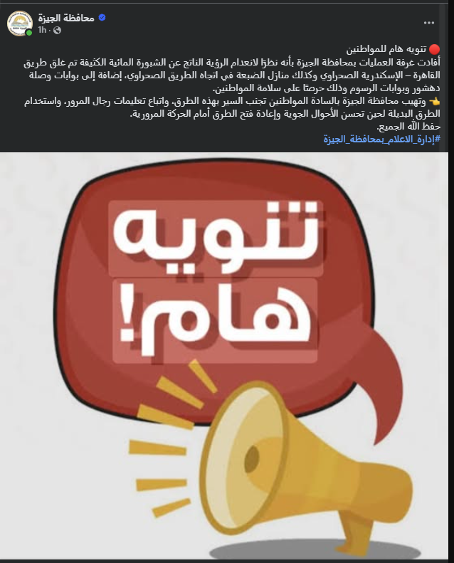 وأكدت المحافظة أن قرار الغلق جاء حرصًا على سلامة المواطنين ومنعًا لوقوع الحوادث المرورية، لحين تحسن الأحوال الجوية وعودة الرؤية إلى معدلاتها الطبيعية.، حيث تهيب محافظة الجيزة المواطنين تجنب السير بهذه الطرق، واتباع تعليمات رجال المرور، واستخدام الطرق البديلة لحين تحسن الأحوال الجوية وإعادة فتح الطرق أمام الحركة المرورية.