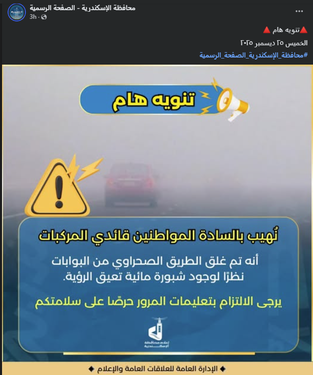 ومع تغيّر الأجواء، يتساءل الكثير من المواطنين حول هل طريق مصر إسكندرية الصحراوي مغلق اليوم بسبب الشبورة؟