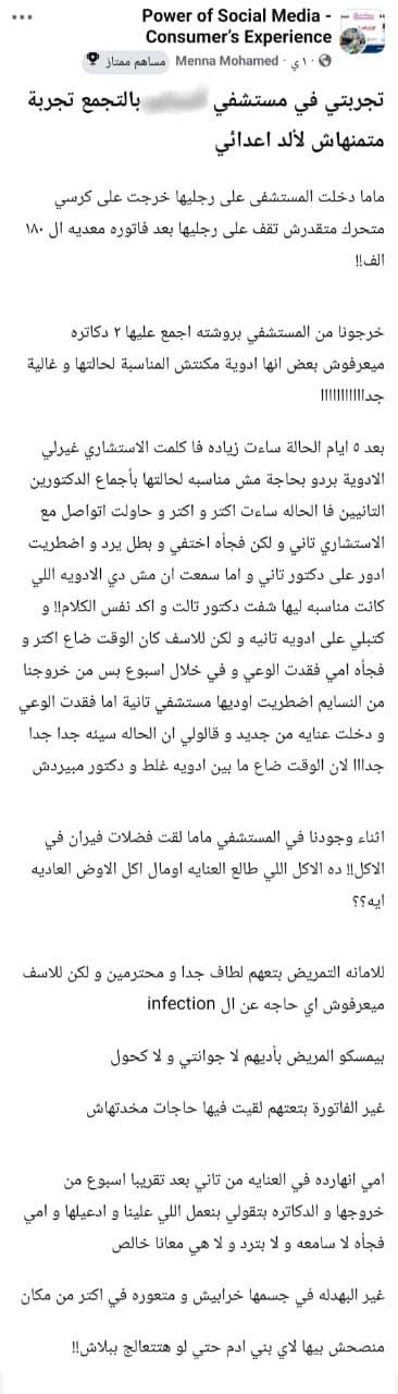 واختتمت صاحبة المنشور حديثها بالإشارة إلى أن والدتها ترقد حاليًا في العناية المركزة مرة أخرى، مؤكدة أن حالتها الصحية حرجة للغاية، وأنها تعاني من كدمات وجروح في أماكن متفرقة من جسدها، معبرة عن استيائها الشديد، ومشددة على أنها لا تنصح بالتعامل مع هذه المستشفى حتى لو كان العلاج بالمجان، على حد تعبيرها.