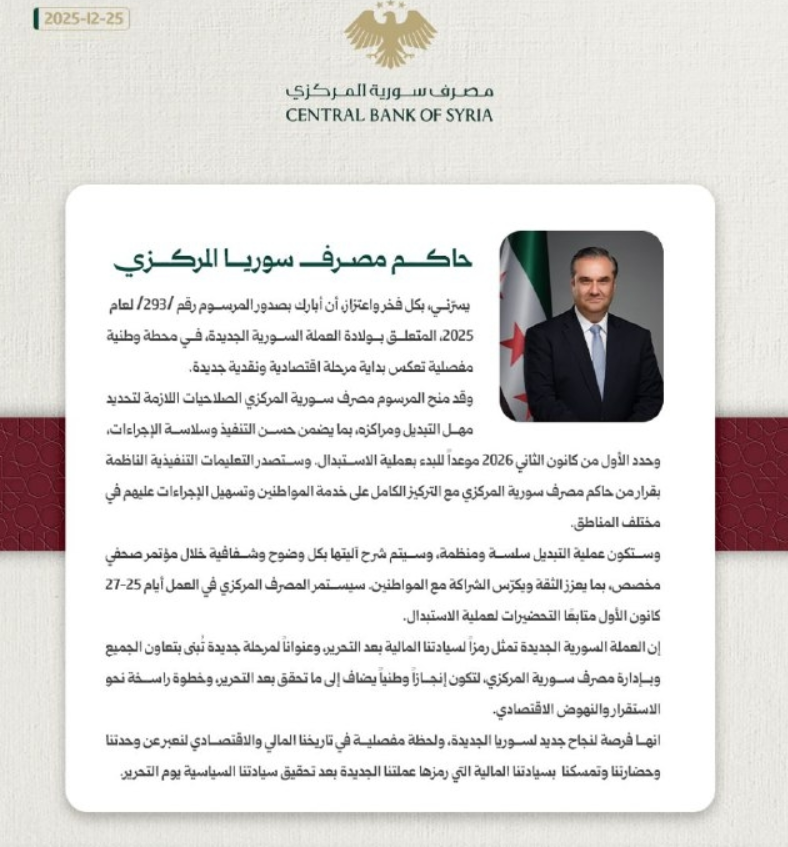 أعلن مصرف سوريا المركزي، اليوم، ولادة عملة البلاد الجديدة، على أن تبدأ عملية استبدال أوراق النقد القديمة اعتبارًا من اليوم الأول من العام الجديد 2026، في خطوة وصفتها السلطات النقدية بأنها بداية مرحلة اقتصادية ونقدية جديدة.