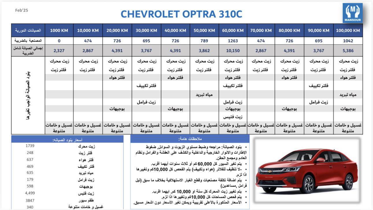 أسعار الصيانة الدورية لسيارة شيفروليه أوبترا 2026
