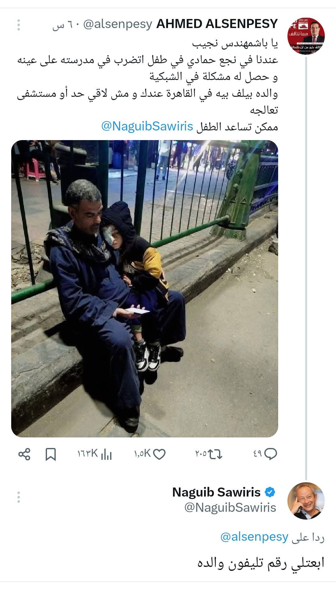 وسرعان ما لاقت المناشدة صدى واسع، حيث رد رجل الأعمال نجيب ساويرس على المنشور، مطالبًا بالحصول على رقم هاتف والد الطفل، في خطوة إنسانية تهدف إلى التدخل العاجل ومساعدة الأسرة في علاج الطفل وتخفيف معاناته.