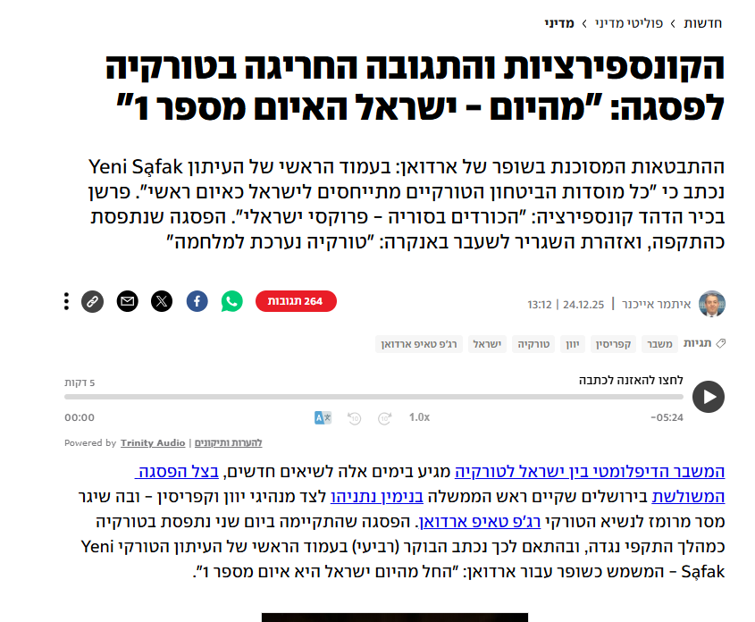 وإذا لم يتم التوصل إلى اتفاق حتى لو كان سريًا، فقد تشهد الأراضي السورية أول مواجهة بين أنقرة والكيان، إذ لا يجرؤ أي طرف على مهاجمة الآخر مباشرة، وفق ما ذكر السفير الإسرائيلي السابق في تركيا، ألون ليئيل، لموقع "واي نت" العبري.