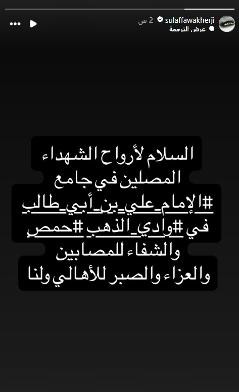 وكتبت سلاف فواخرجي عبر حسابها على منصة “إنستجرام”: “السلام لأرواح الشهداء المصلين في جامع الإمام علي بن أبي طالب في وادي الذهب حمص، والشفاء للمصابين والعزاء والصبر للأهالي ولنا”.