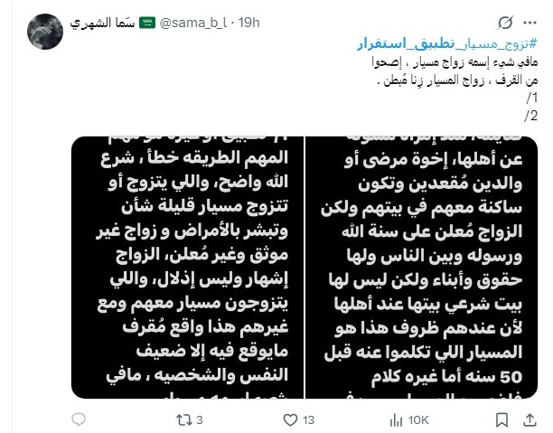 أثار التطبيق حالة واسعة من الجدل على منصة إكس، وكتبت إحدى مستخدمي المنصة: “ما في شيء اسمه زواج مسيار، اصحوا من القرف، زواج المسيار زِنا مُبطن”.