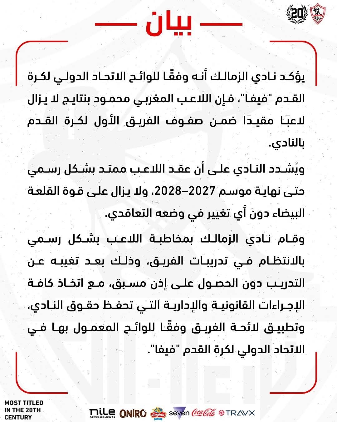 أصدر نادي الزمالك بيانًا رسميًا أكد فيه أن المغربي محمود بنتايج لا يزال مقيدًا في صفوف الفريق الأول لكرة القدم بالنادي، وذلك وفقًا للوائح الاتحاد الدولي لكرة القدم «فيفا»، مشيرًا إلى أن عقده ممتد حتى نهاية موسم 2027–2028 دون أي تغيير في وضعه التعاقدي.