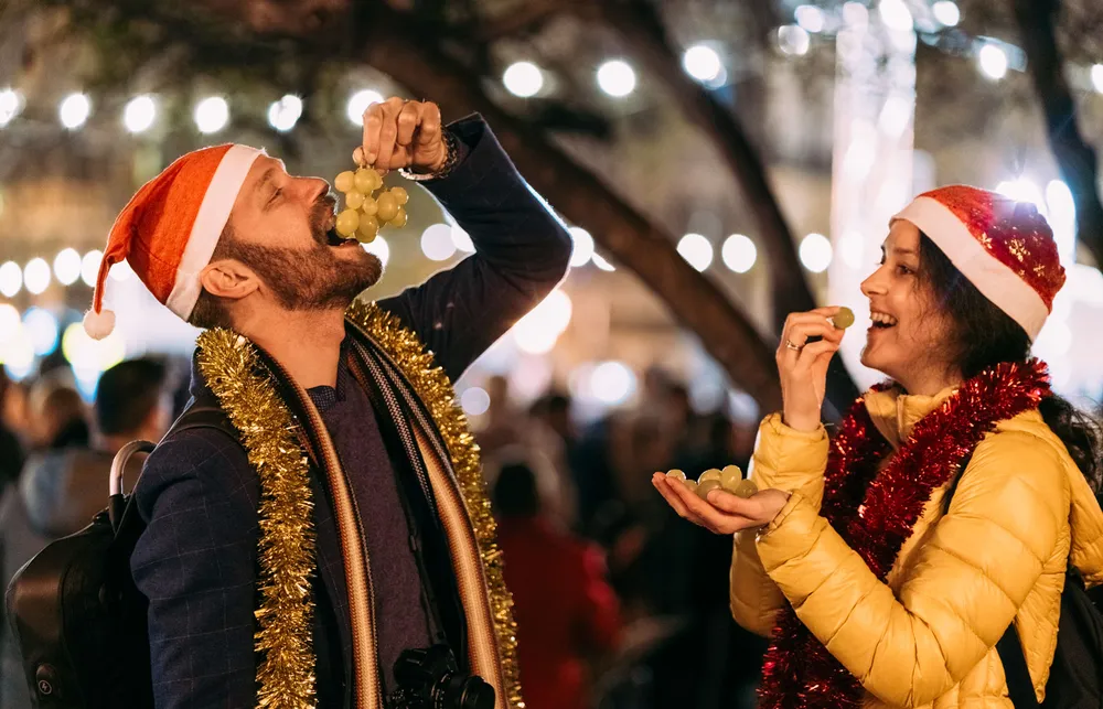 في مناطق كإسبانيا وأمريكا اللاتينية تنتشر عادة أكل 12 حبة من العنب في ليلة رأس العام، لأن كل حبة ترمز لرقم شهر من شهور العام الجديد، من يناير حتى ديسمبر، ويعتقد أن ذلك يرتبط بالحظ الوفير والاستعداد للمستقبل.