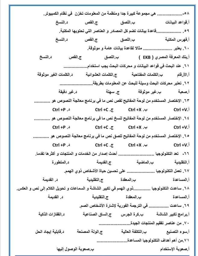 تتضمن مراجعة تكنولوجيا الصف السادس الابتدائي 2025-2026 نماذج متنوعة من الأسئلة بما يساعد الطلاب على تثبيت المعلومات ومراجعة المنهج بشكل منظم قبل الامتحانات، ويمكن للطلاب الاطلاع على المراجعة من خلال الصور التالية:
