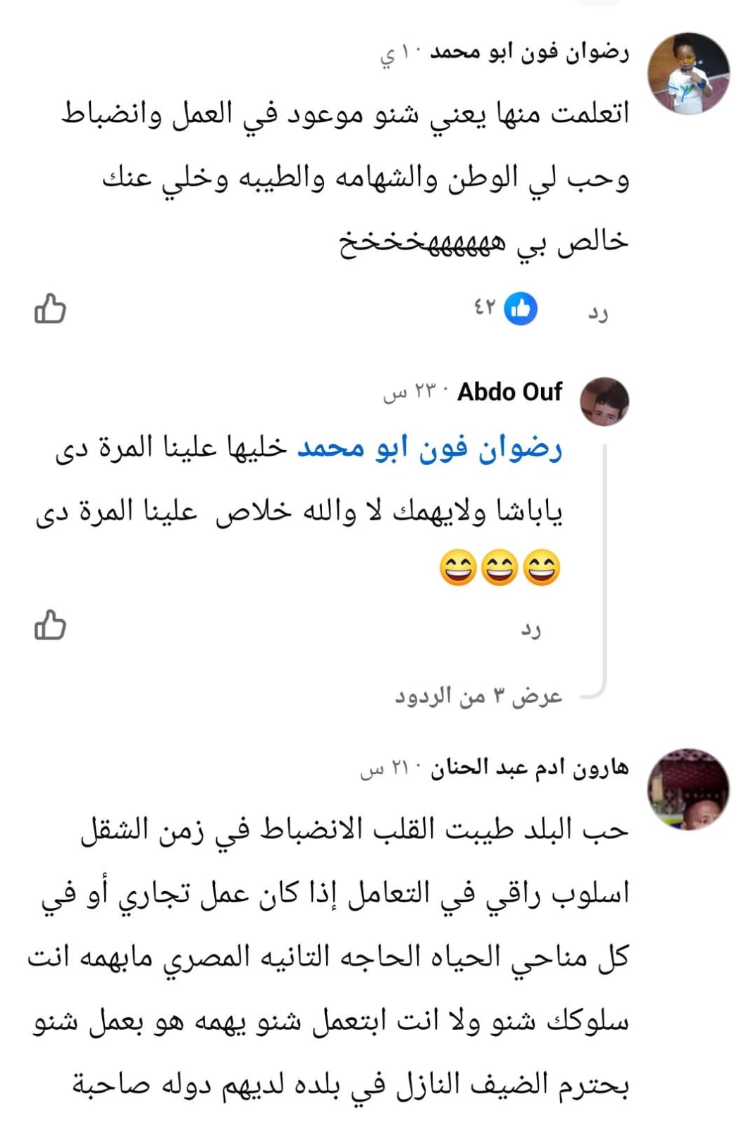 وأضاف آخر يدعى هارون آدم: "حب البلد وطيبة القلب والانضباط في زمن الشغل، والأسلوب الراقي في التعامل، إذا كان عمل تجاري أو في كل مناحي الحياة، الحاجة التانية المصري ما بيهمه إنت سلوكك إيه، ولا إنت بتعمل إيه، يهمه هو بيعمل إيه، بيحترم الضيف النازل في بلده.. لديهم دولة صاحبة قانون لا كبير على القانون".