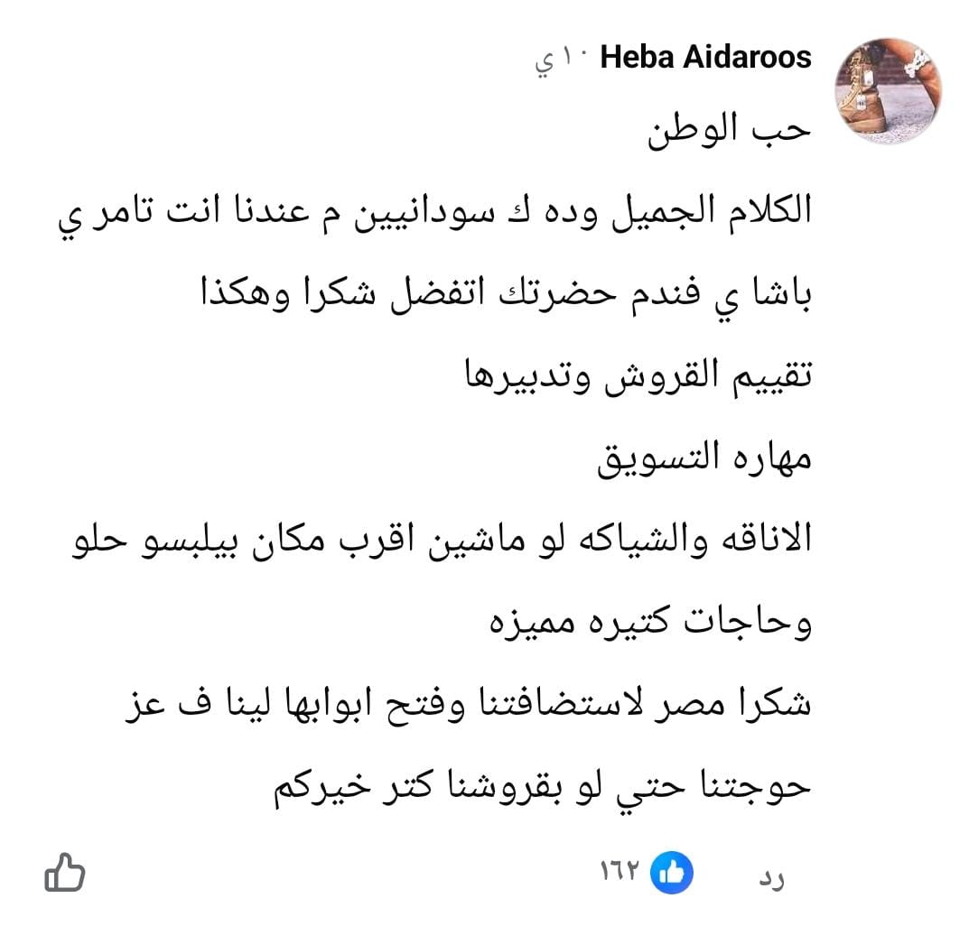 وكتبت هبة: "تعلمت حب الوطن.. والكلام الجميل، وده كسودانيين مش عندنا مثل أنت تؤمر يا باشا، يا فندم، حضرتك اتفضل، شكرا وهكذا.. مهارة التسويق والأناقة والشياكة، لو ماشين لأقرب مكان بيلبسوا حلو"، واختتمت: "شكرا مصر لاستضافتنا وفتح أبوابها لينا في عز حوجتنا حتى لو بفلوسنا كتر خيركم".