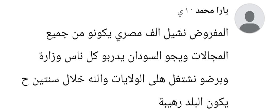 اقترحت السودانية يارا، تسفير نحو ألف مصري في شتى المجالات إلى السودان، حتى يتدرب الشعب السوداني على أيديهم، قائلة: "والله خلال سنتين هتكون البلد رهيبة".