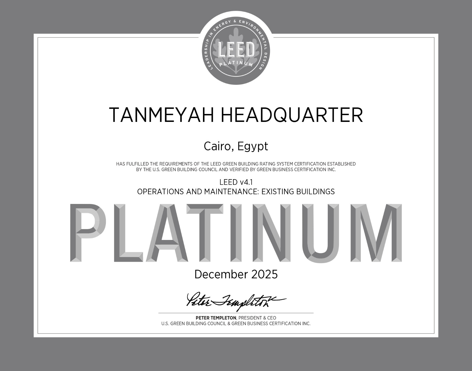 وتعكس شهادة البلاتينيوم منهج تنميه المتكامل في الاستدامة، الذي يمتد إلى ما هو أبعد من البنية التحتية ليشمل التميز التشغيلي، وصحة الموظفين، والأثر المجتمعي