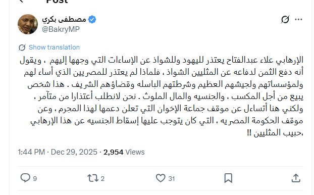 وأشار بكري في تدوينة له على منصة “إكس”، إلى أن علاء عبدالفتاح اعتذر لليهود وللمثليين عن الإساءات التي وجهها إليهم، ويزعم أنه دفع ثمن دفاعه عن المثليين، متسائلًا: لماذا لم يعتذر للمصريين الذي أساء لهم ولمؤسساتهم ولجيشهم العظيم وشرطتهم الباسله وقضاؤهم الشريف؟.