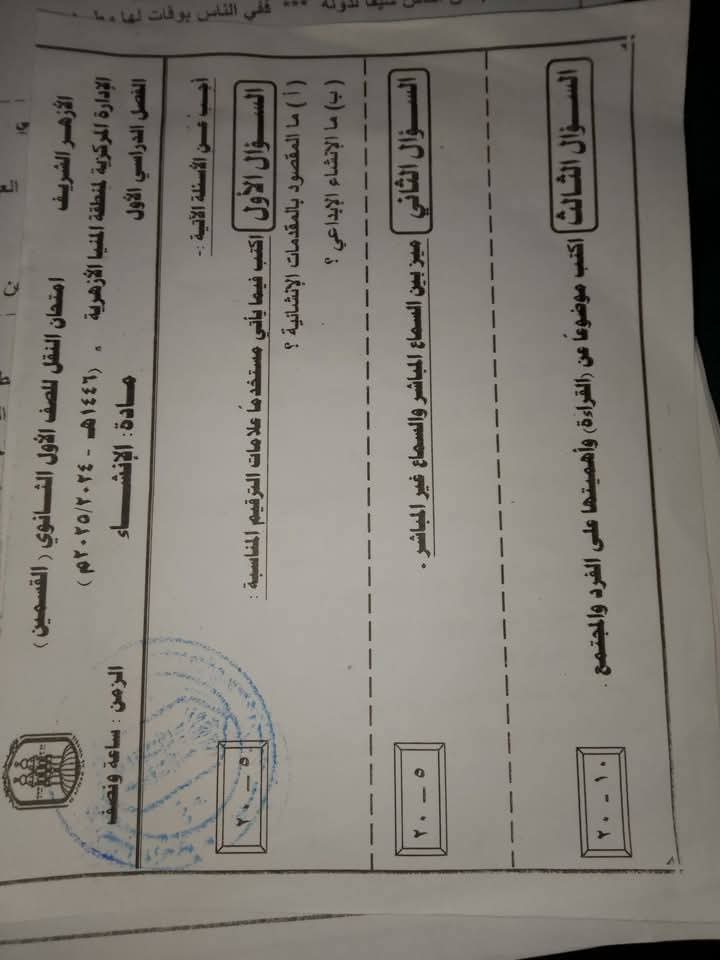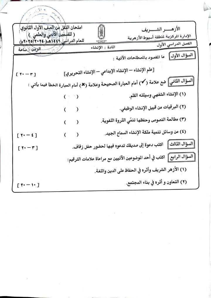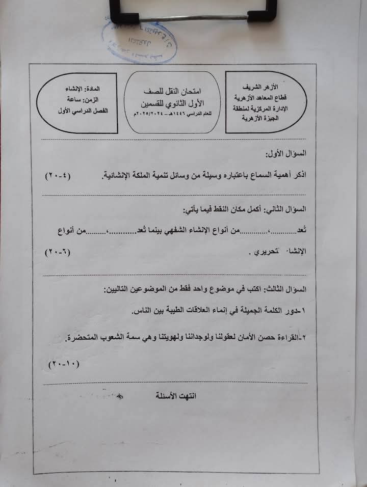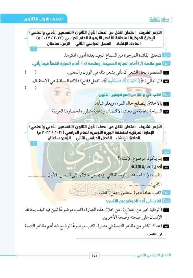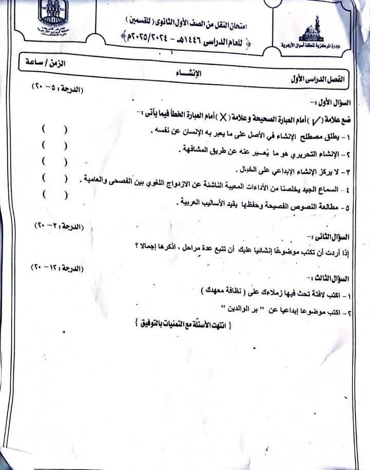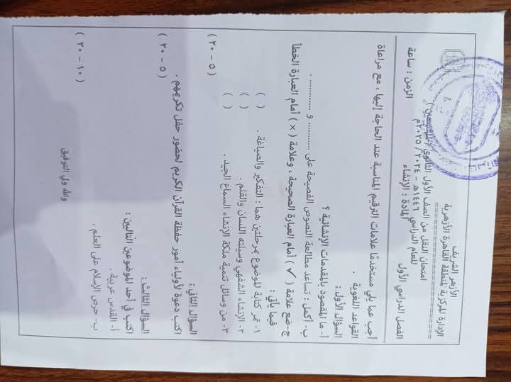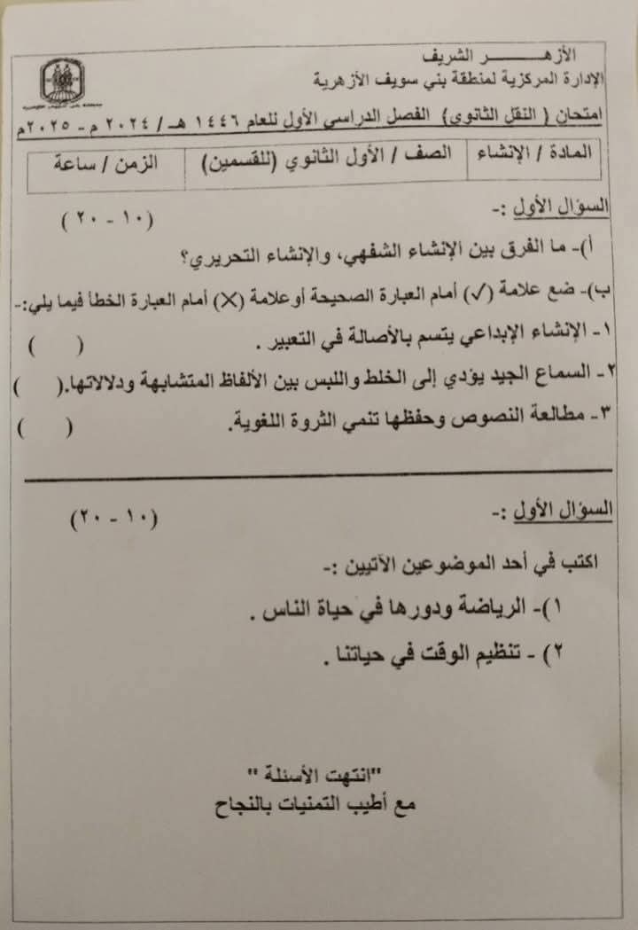 نماذج امتحان الإنشاء للصف الأول الثانوي الأزهري