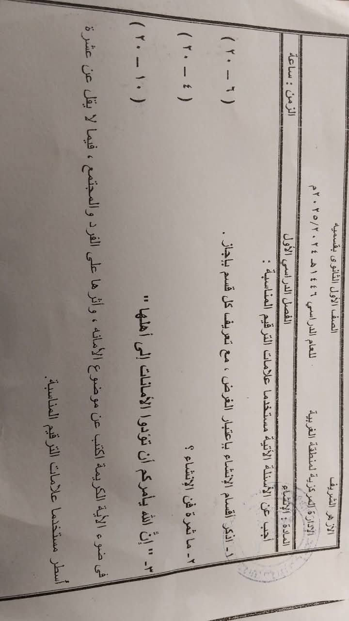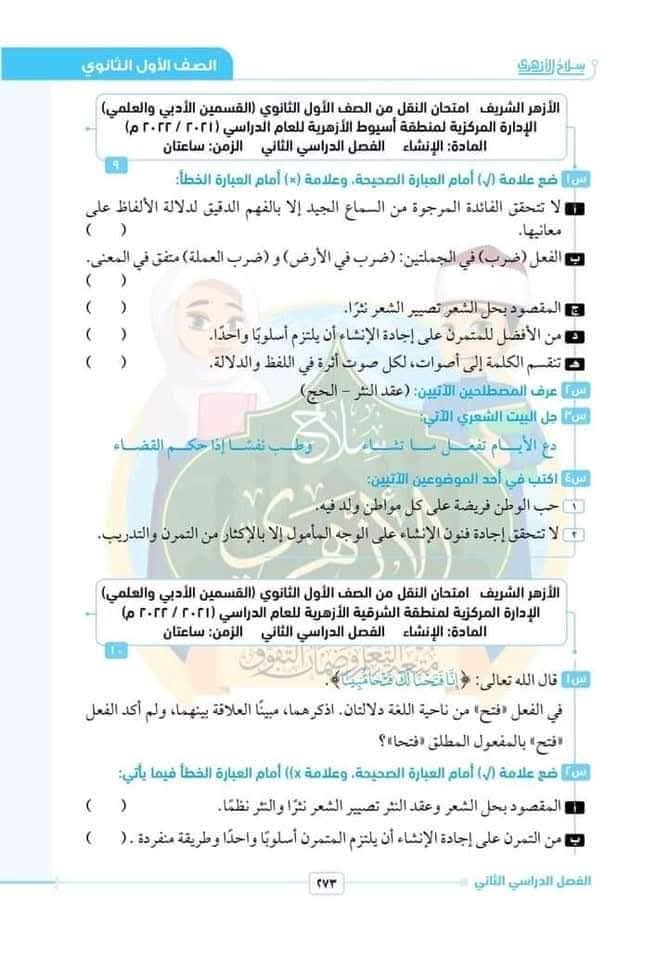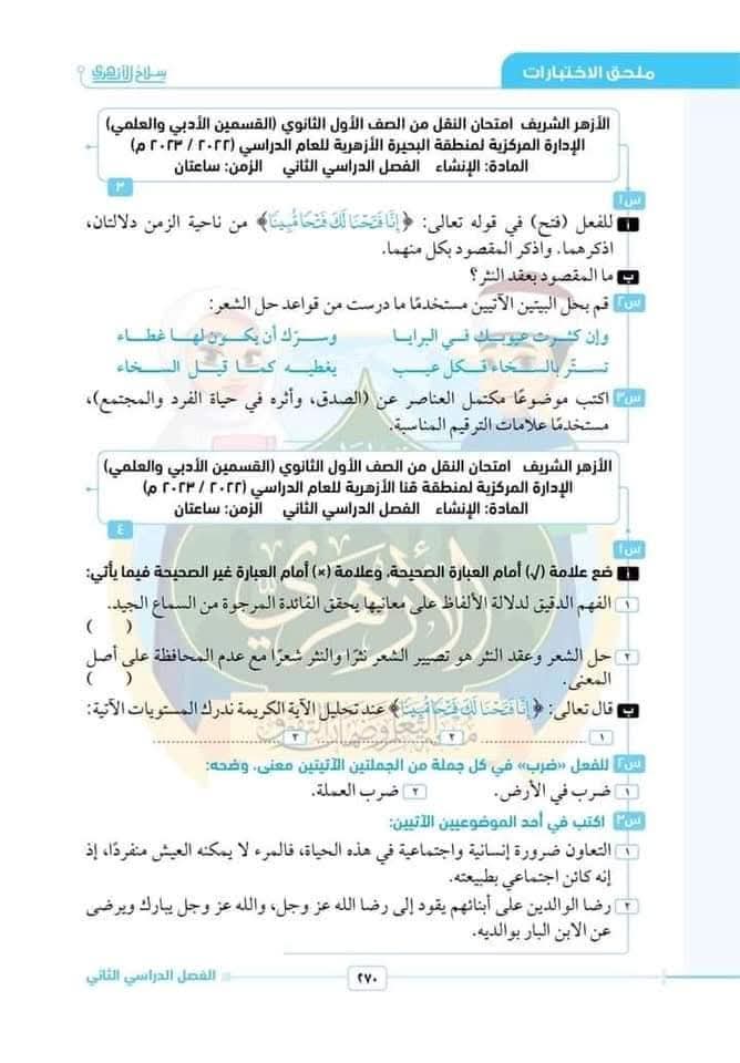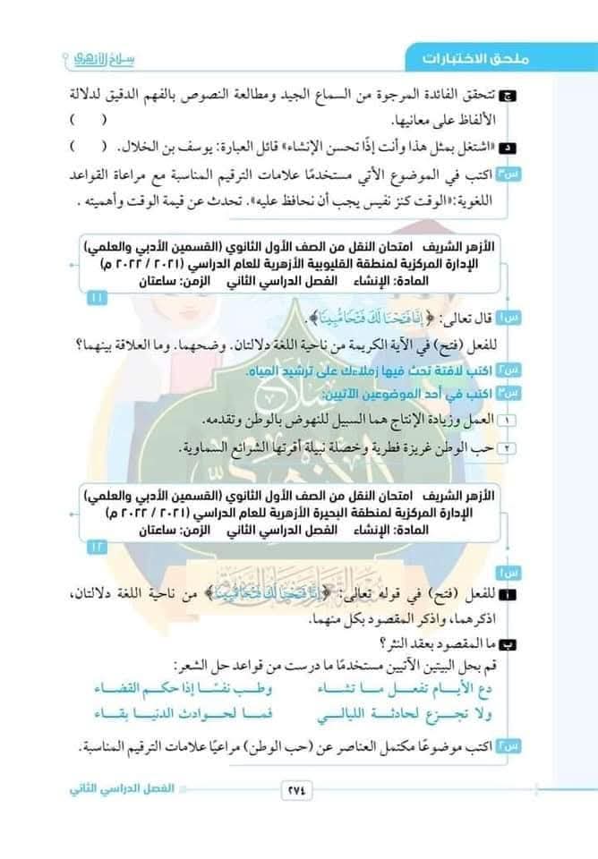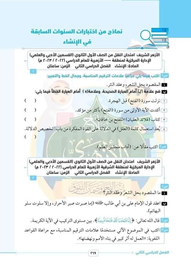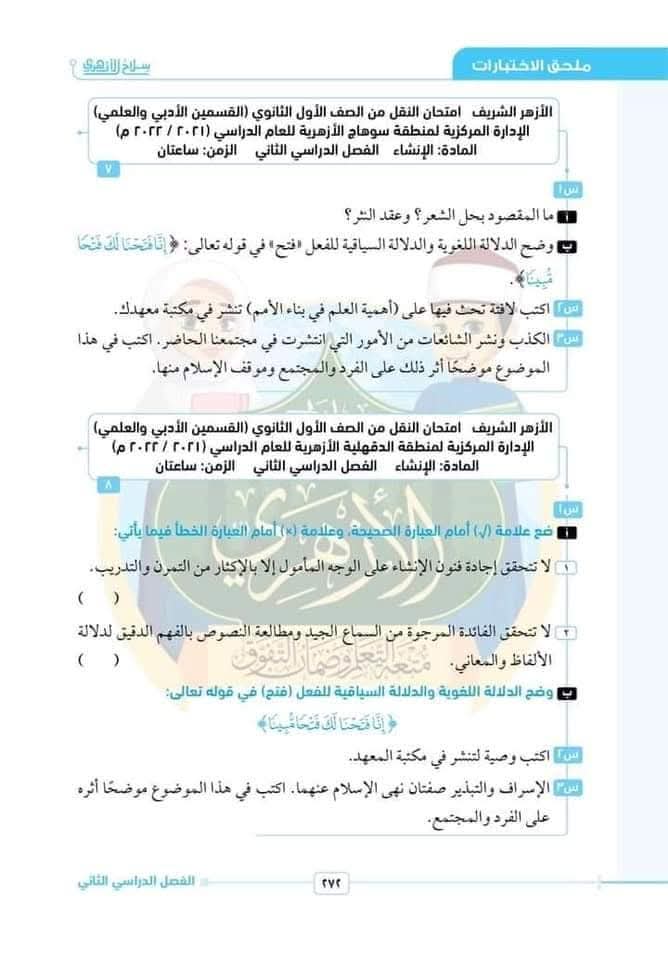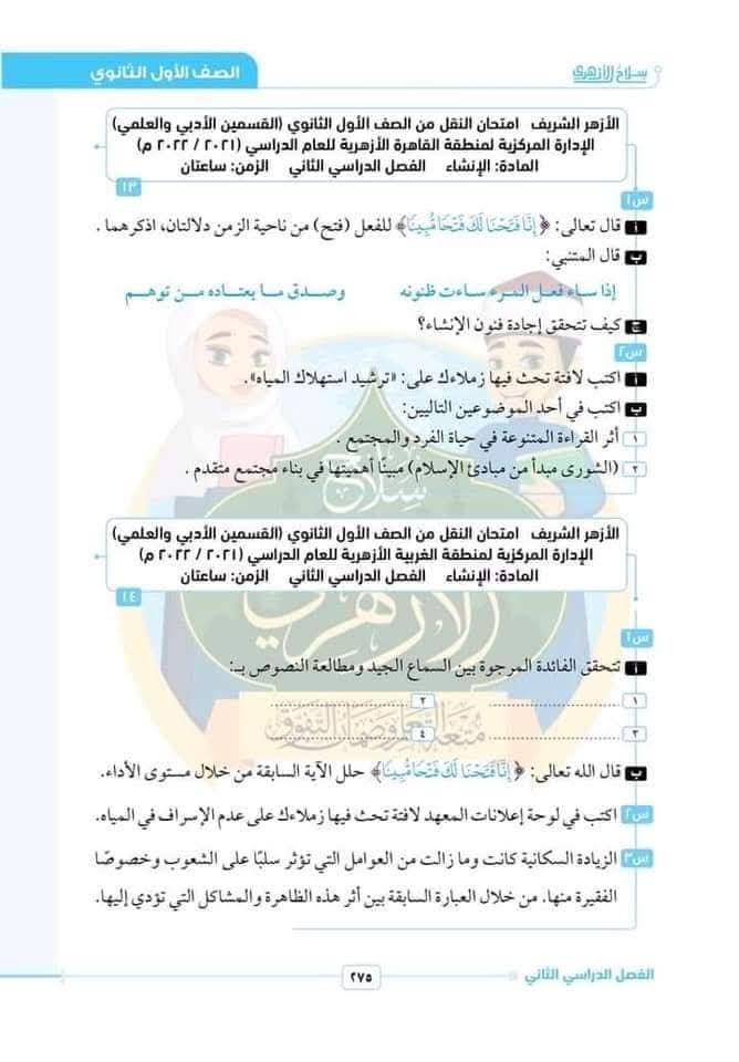 نماذج امتحان الإنشاء للصف الأول الثانوي الأزهري