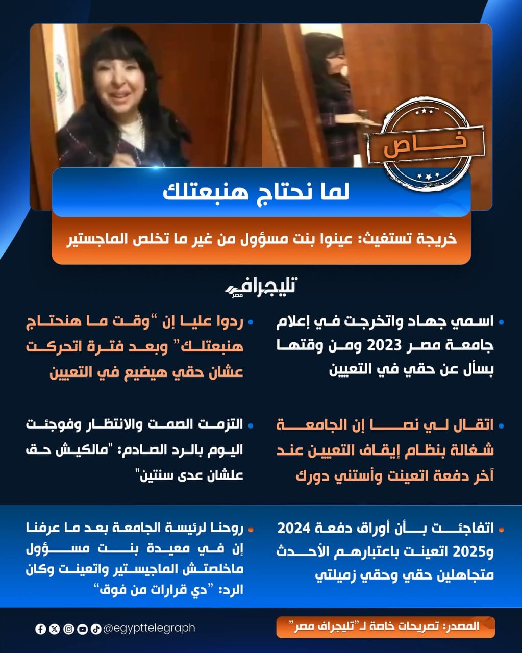 جهاد التي تخرجت في كلية الإعلام بجامعة مصر للعلوم والتكنولوجيا (MUST)، قالت إنها كانت الأولى على دفعتها بقسم الإذاعة والتلفزيون “عربي” عام 2023، ومنذ عامين وهي تسأل إدارة الجامعة عن حقها في التعيين، والرد دائمًا هو: "لما نحتاج هنبعتلك".
