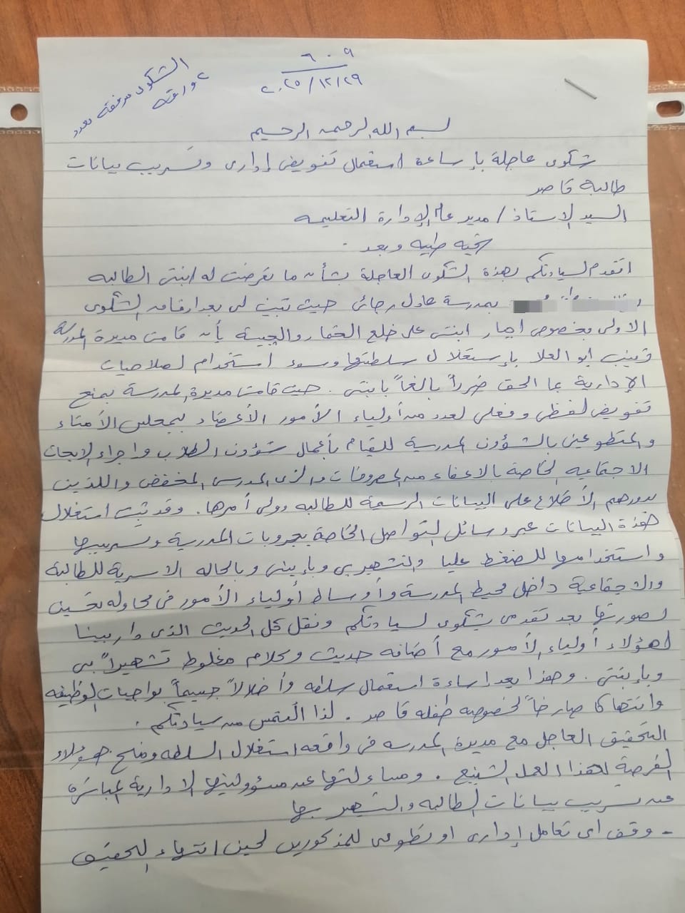 وأضافت أنها طلبت التحدث مع أي مسؤول داخل المدرسة، لكن لم يرد عليها أحد ، في ظل وجود مديرة المدرسة وعدد من المعلمات دون السماح لها بالتواصل مع أي منهن.