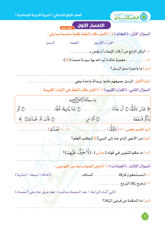 نماذج امتحانات دين للصف الرابع الابتدائي الترم الأول 2026 بالاجابات