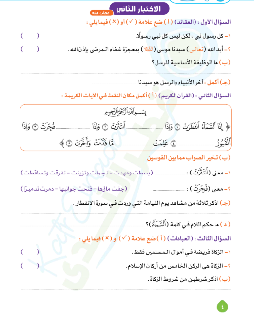 ويستطيع طلاب الصف الرابع الابتدائي الاطلاع على نماذج امتحانات دين الترم الأول 2026 بالاجابات والتي تعد وسيلة فعّالة لمراجعة المادة قبل الامتحان من خلال الصور التالية :