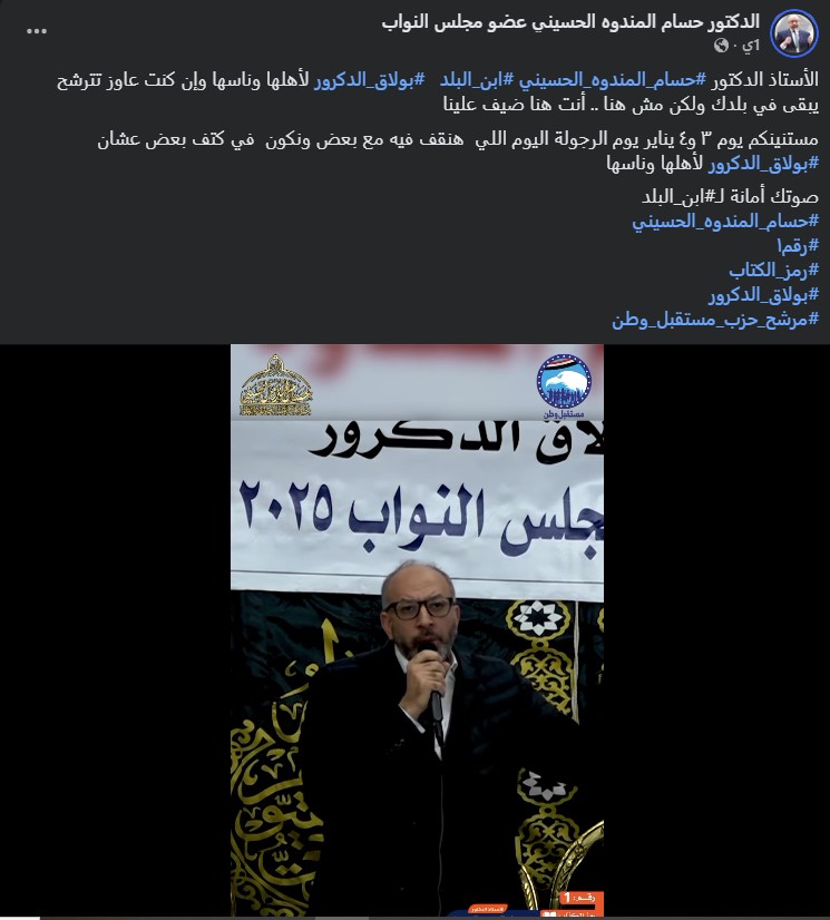 من جانبه، قال حسام المندوه الحسيني، مرشح حزب “مستقبل وطن” عن دائرة بولاق الدكرور، خلال إحدى حملاته الانتخابية، إن الدائرة يجب أن يعبّر عنها أبناؤها الحقيقيون، قائلًا: “الدائرة لأولادها، بولاق الدكرور لأهلها وناسها وإن كنت عاوز تترشح يبقى في بلدك ولكن مش هنا أنت هنا ضيف علينا".