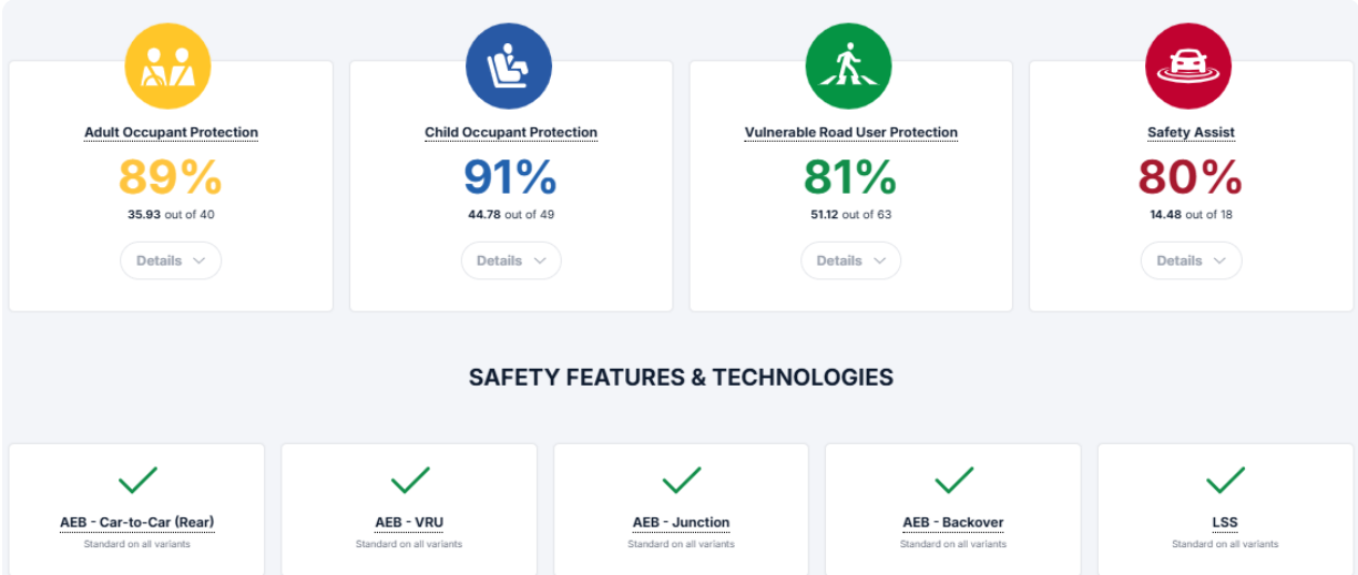 وشهد التقييم حماية الركاب البالغين: 89%، وحماية الأطفال: 91%، حماية مستخدمي الطريق: 81%، وأنظمة السلامة والمساعدة: 80%