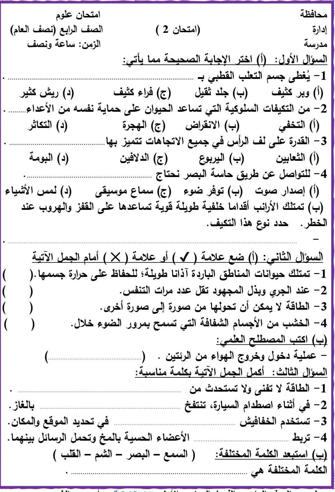 نماذج امتحانات علوم الصف الرابع الابتدائي