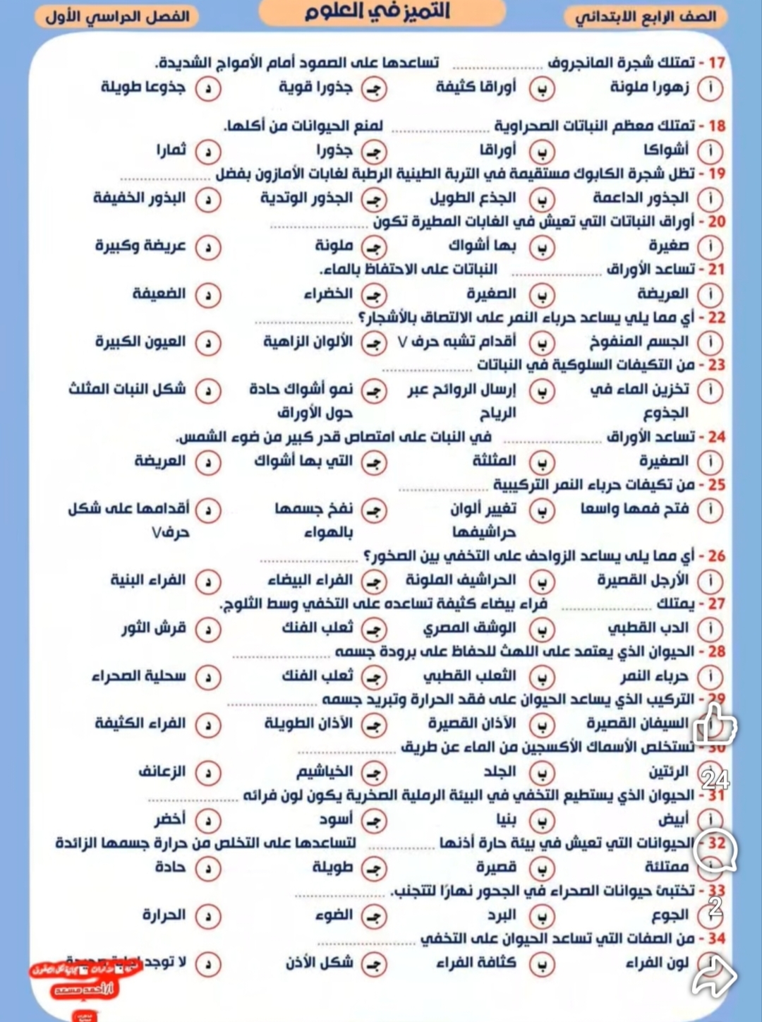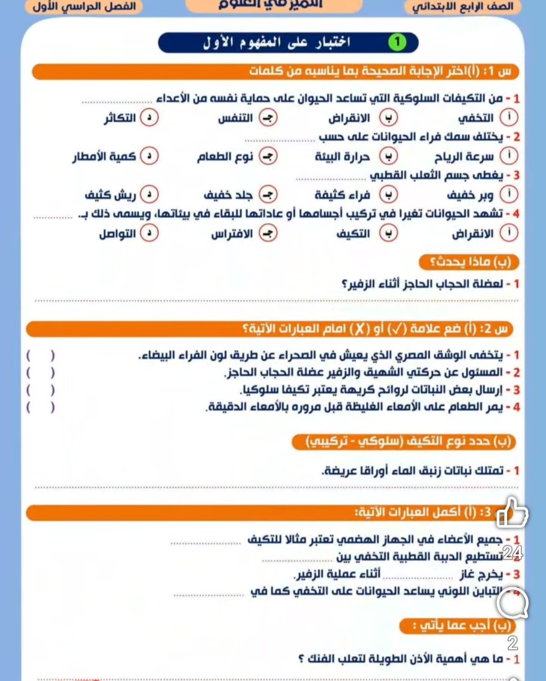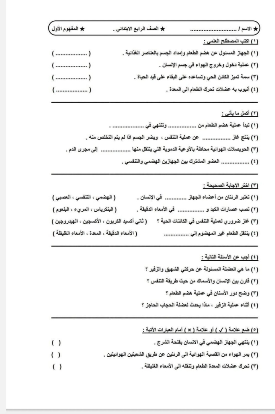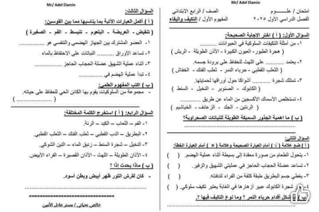 نماذج امتحان علوم للصف الرابع الابتدائي المنهج الجديد