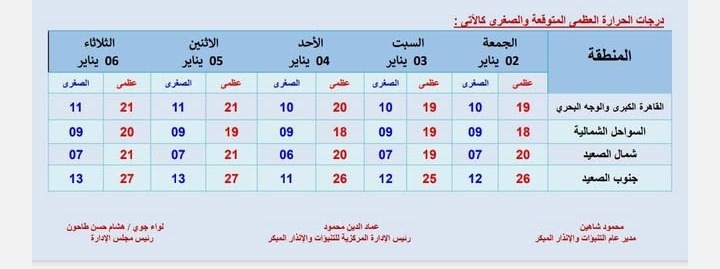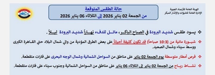 وهناك فرص أمطار متوسطة يوم الجمعة 2 يناير على محافظة القاهرة ومناطق من السواحل الشمالية وشمال الوجه البحري على فترات متقطعة، بالإضافة إلى نشاط رياح من الجمعة 2 يناير إلى الثلاثاء 6 يناير على مناطق من السواحل الشمالية وجنوب سيناء على فترات متقطعة.