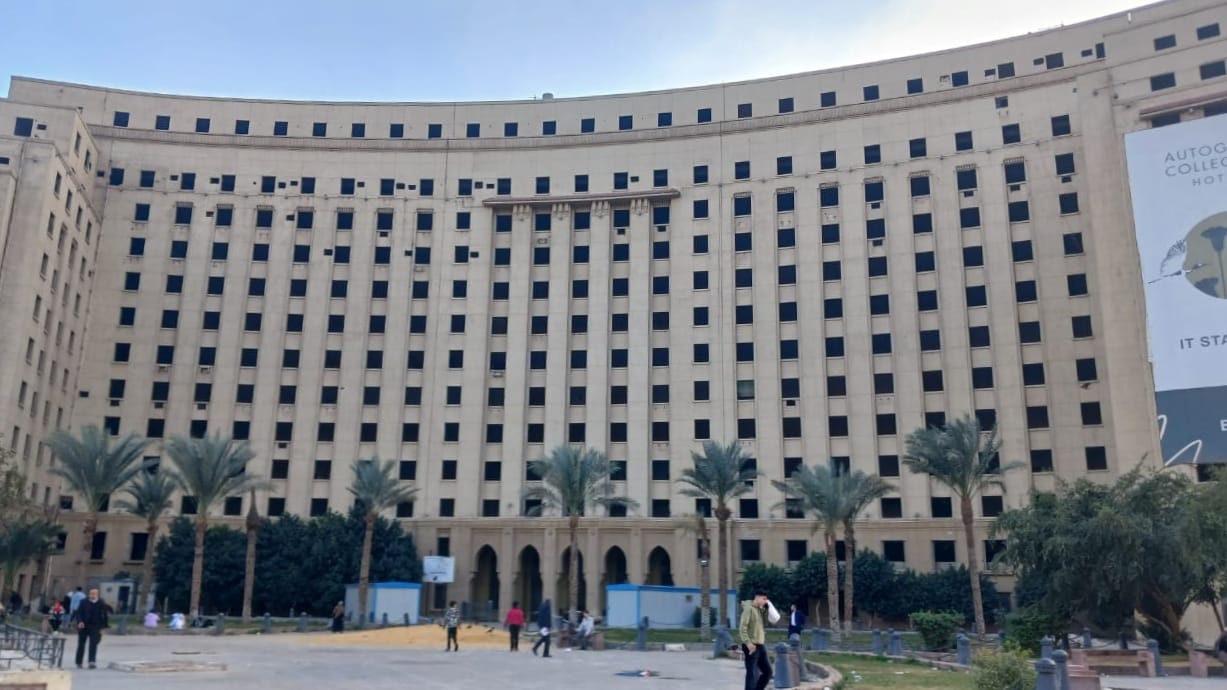 أمام المبنى، الذي يعود تاريخه إلى عهد الملك فاروق بتصميم المهندس محمد كمال إسماعيل وافتتح في عام 1951 كمركز لكافة المصالح الحكومية، تنتشر بقايا حطام ورمال متناثرة، آثار لما كان وما لم يكتمل، وتمتد حديقة واسعة بمحاذاته، حيث يتنزه الناس في هدوء، ويجري الصغار وهم يلعبون ضاحكين.