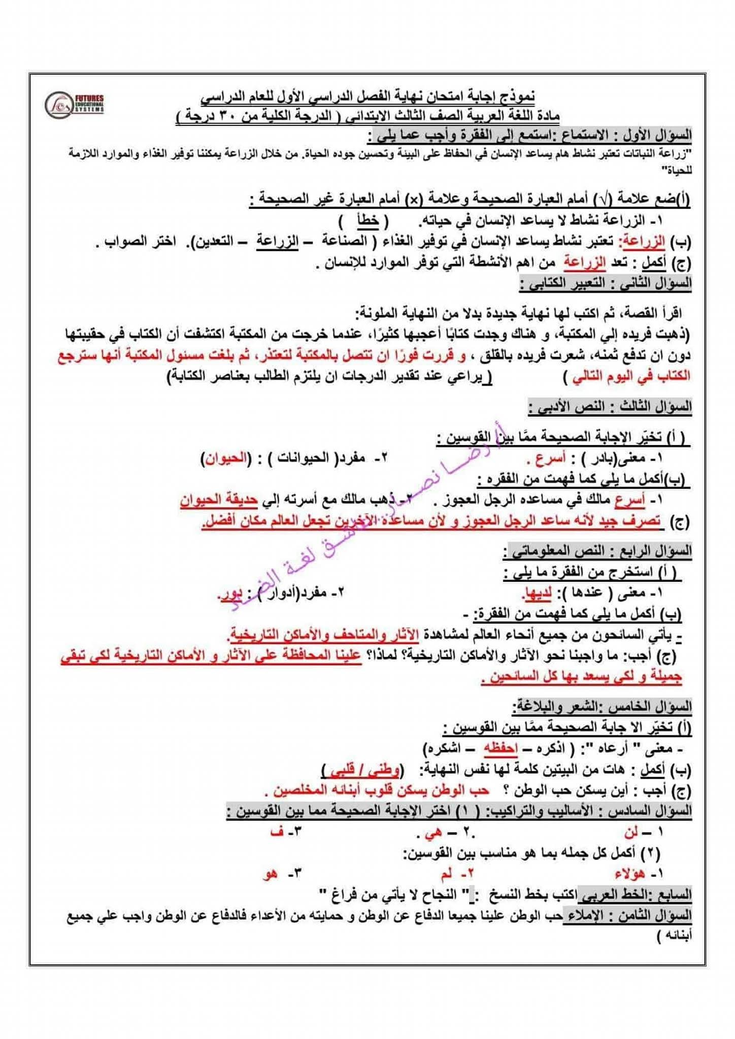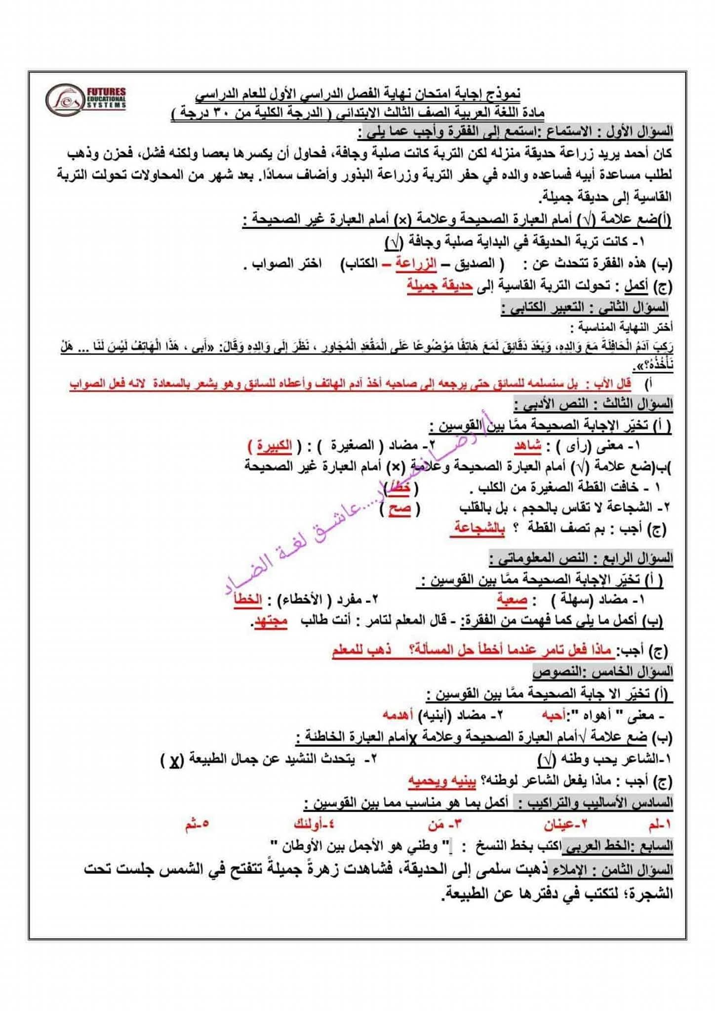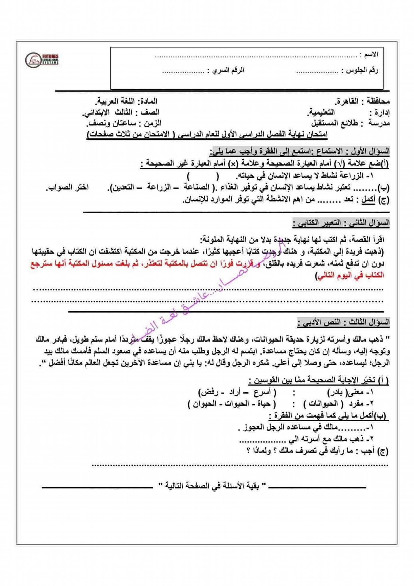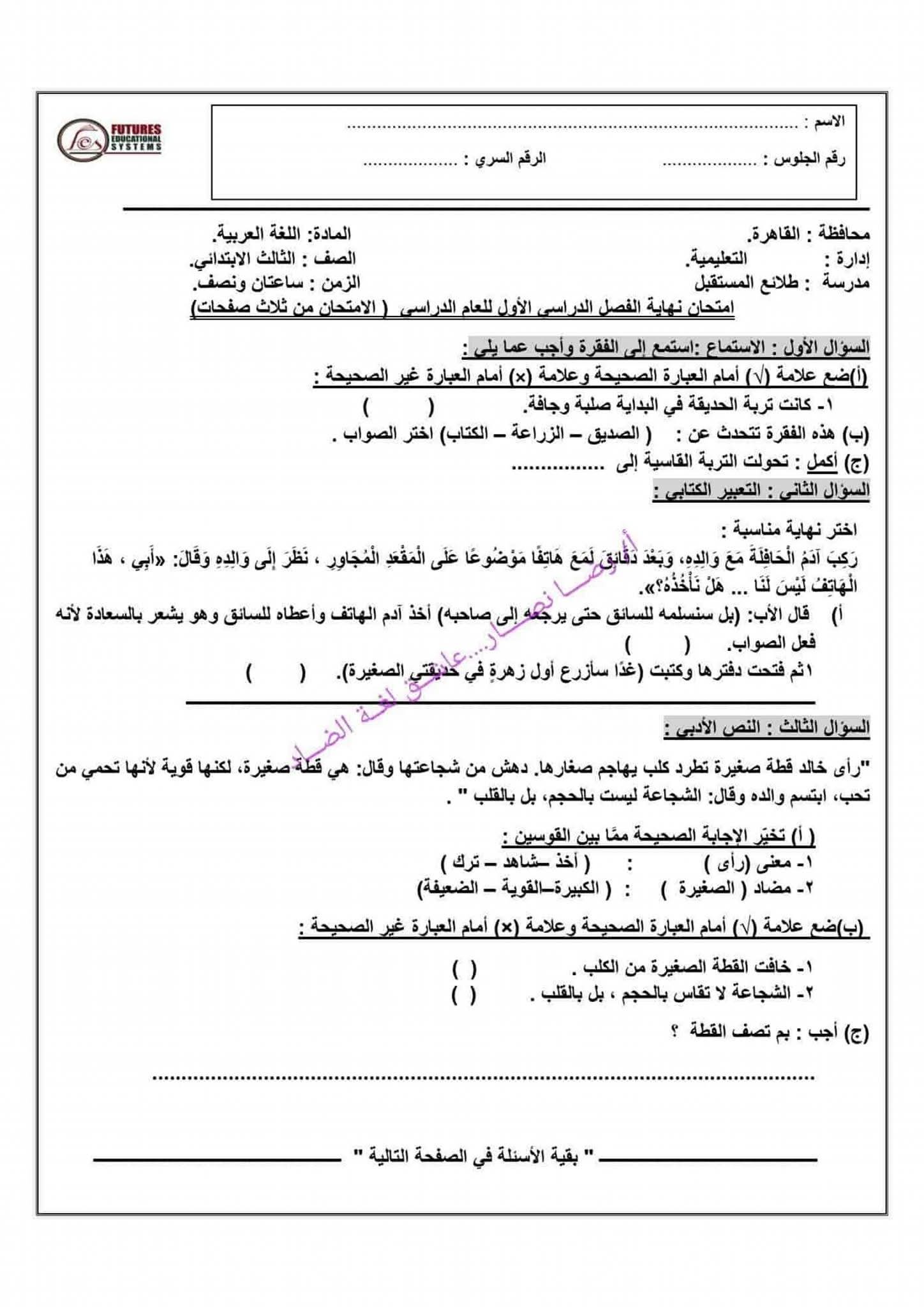 ويستطيع طلاب الصف الثالث الابتدائي الاطلاع على نماذج امتحان اللغة العربية كالتالي: