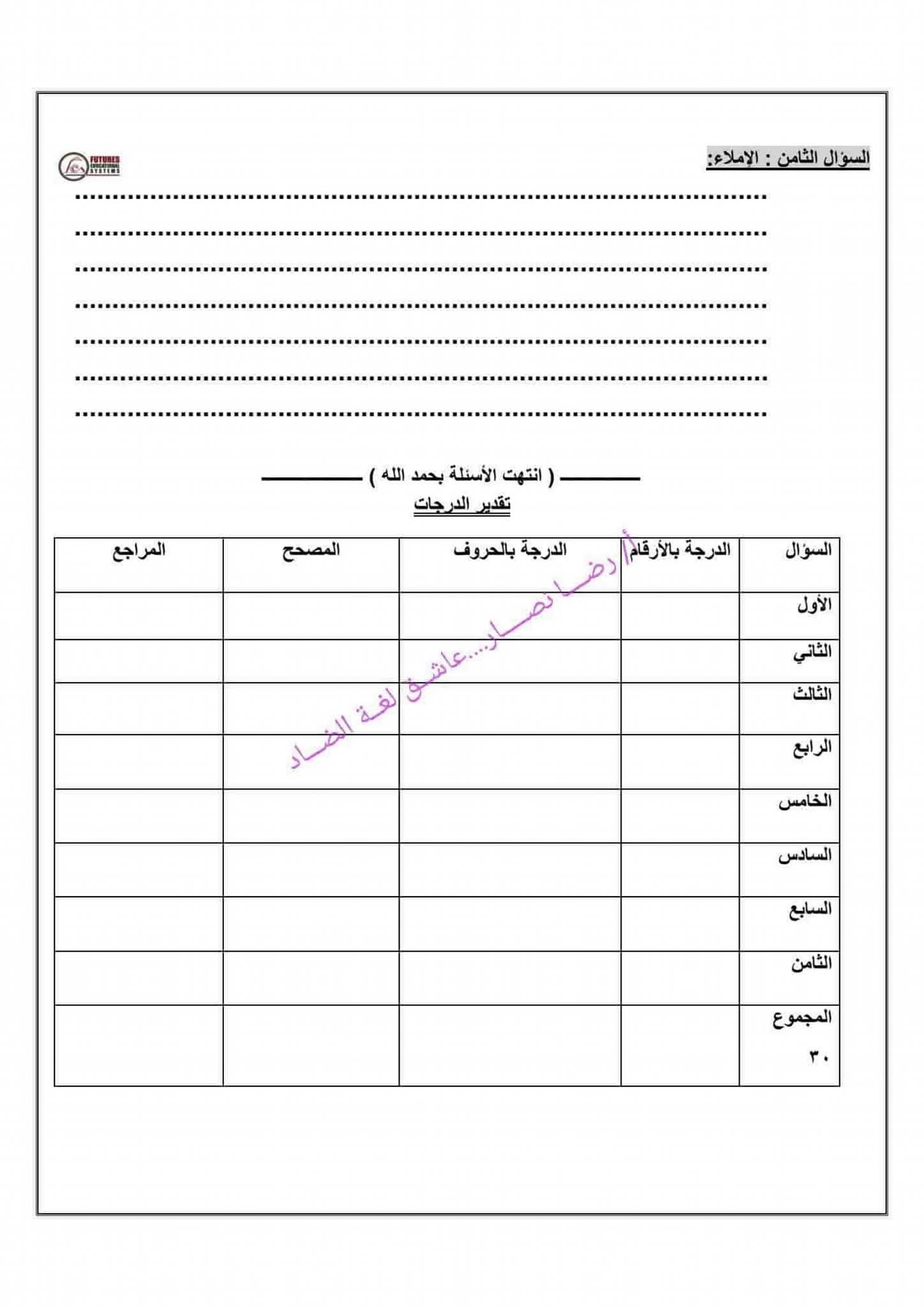 نماذج امتحان اللغة العربية الصف الثالث الابتدائي