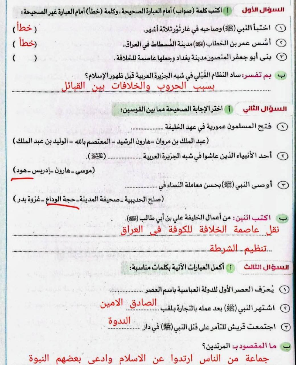 السؤال الرابع: اكتب كلمة “صح” أو “خطأ”: نقل الخليفة عثمان بن عفان مقر الخلافة إلى الكوفة.
