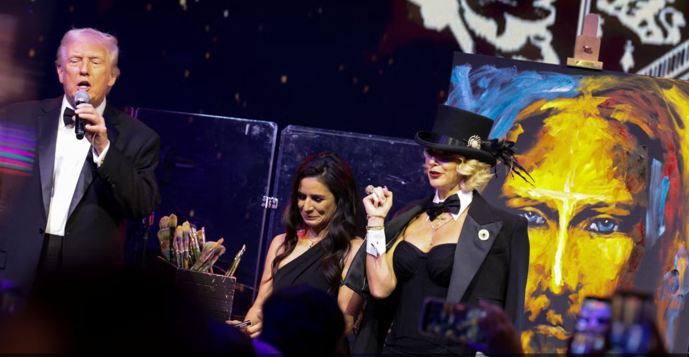 اللوحة رسمتها فنانة العبادة المسيحية فانيسا هورابوينا، المعروفة بنشاطها الواسع على منصة «إنستجرام»، حيث قامت برسمها مباشرة خلال الحفل في غضون نحو 10 دقائق، فيما تولّى ترامب مهمة الترويج لها وبيعها في المزاد.