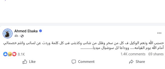 وكتب السقا في منشوره: "حسبي الله ونعم الوكيل في كل من سخر وقلل من شأني وكذبني في كل كلمة وردت على لساني.. وأنتم خصمائي أمام الله يوم القيامة.. ووداعًا للسوشيال ميديا“.