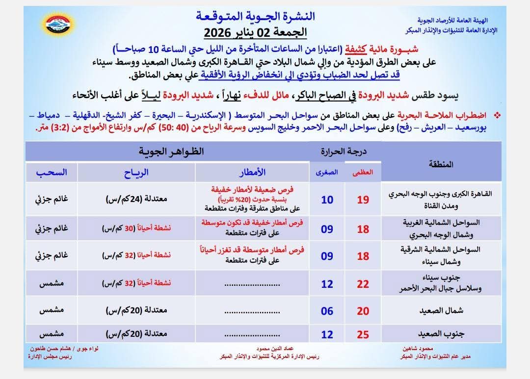 وفيما يخص درجات الحرارة المتوقعة اليوم الجمعة 2 يناير 2026 في أغلب أنحاء الجمهورية، فإنها تأتي على النحو التالي، وفقًا للهيئة العامة للأرصاد الجوية: