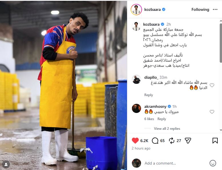 ونشر كزبرة عبر “إنستجرام”، صورةً له من كواليس العمل، وعلّق عليها: "جمعة مباركة على الجميع، بسم الله توكلنا على الله، مسلسل بيبو رمضان 2026، يا رب اجعل في وشنا القبول، تأليف: الأستاذ تامر محسن إخراج: الأستاذ أحمد شفيق إنتاج: ميديا هب – سعدي جوهر".