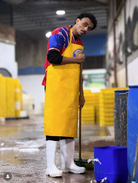 ظهر كزبرة، بإطلالة لافتة، جسّد خلالها شخصية عامل في أحد محلات الدواجن، حيث ارتدى ملابس عمل بسيطة تتناسب مع طبيعة الدور، شملت مريلة صفراء وحذاءً مطاطيًا مخصصًا للأماكن المبللة، ممسكًا بأدوات النظافة، في مشهد يعكس واقعية الشخصية وقربها من تفاصيل الحياة اليومية.