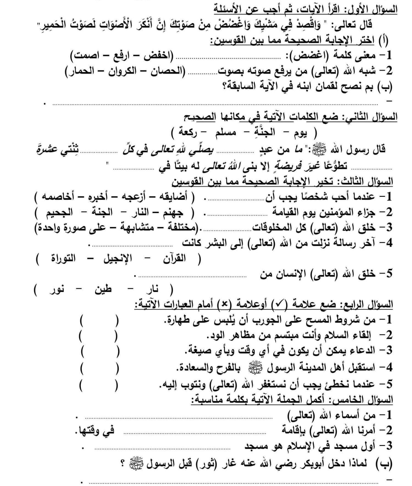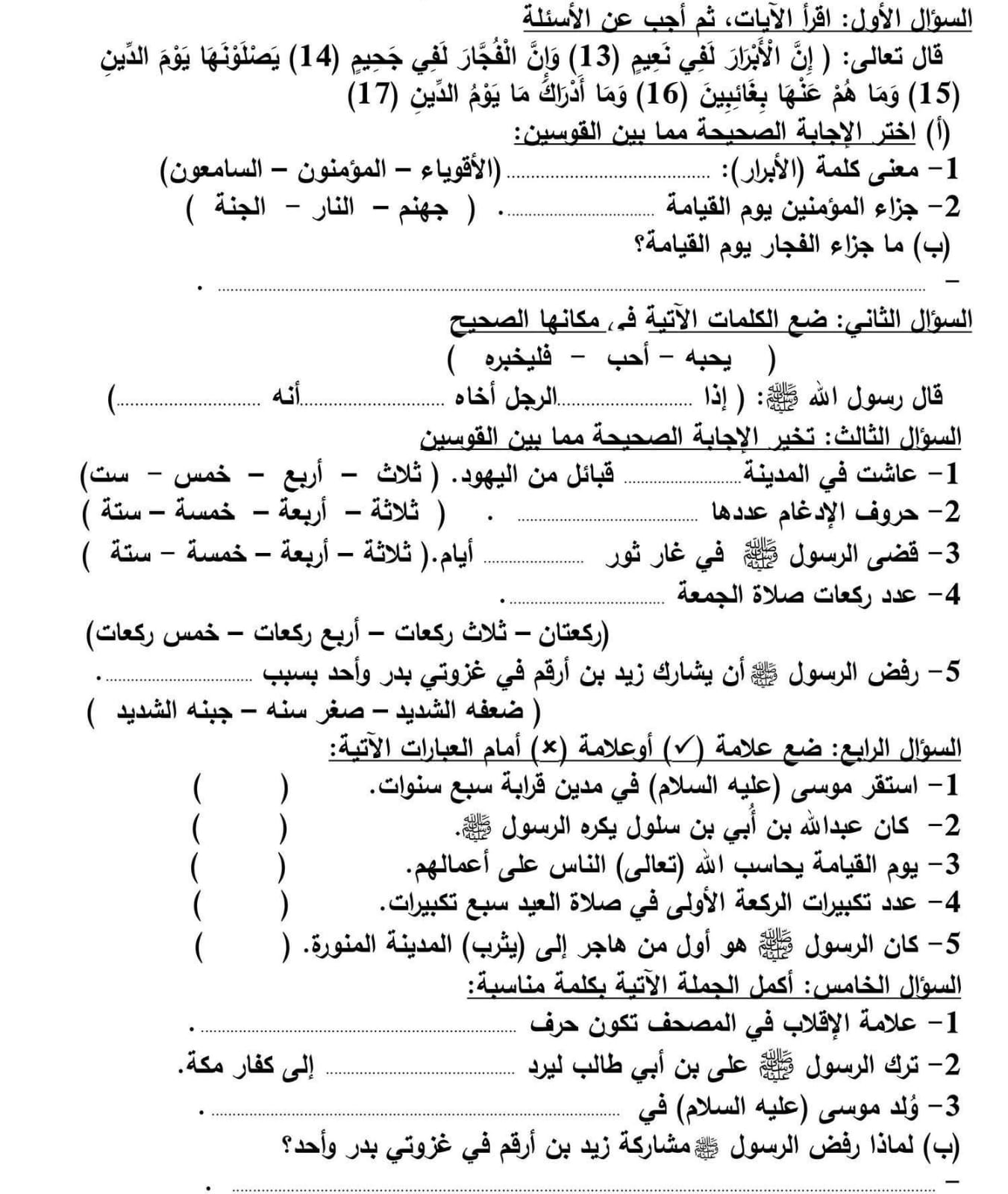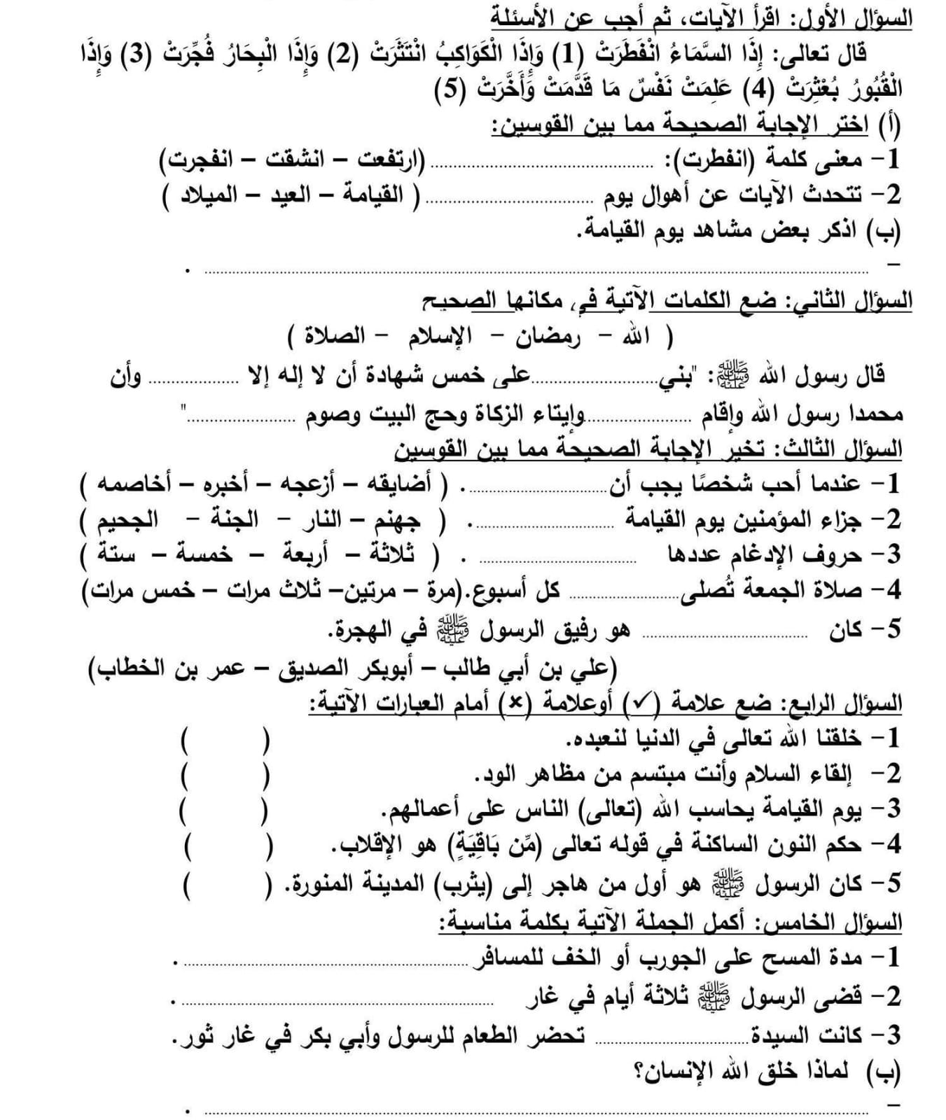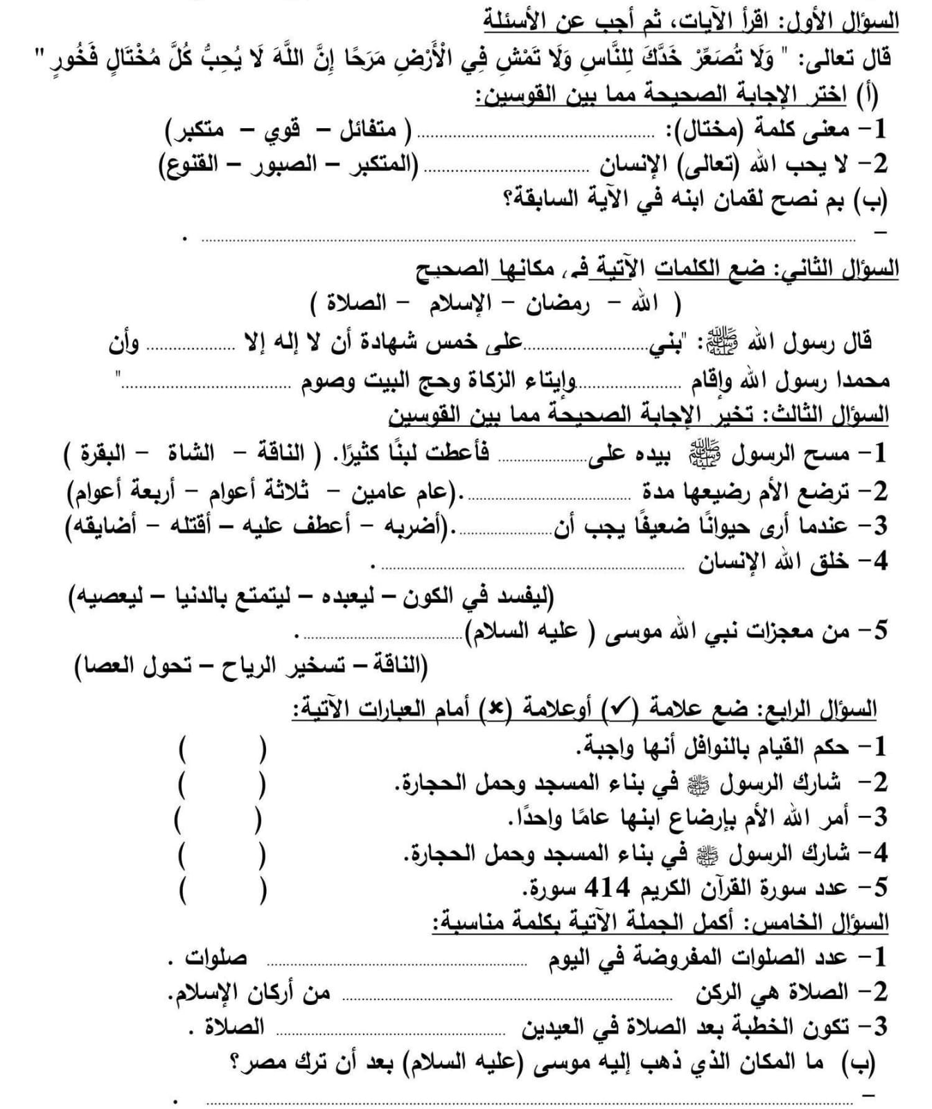 نماذج امتحان دين للصف الخامس الابتدائي الترم الأول 2026
