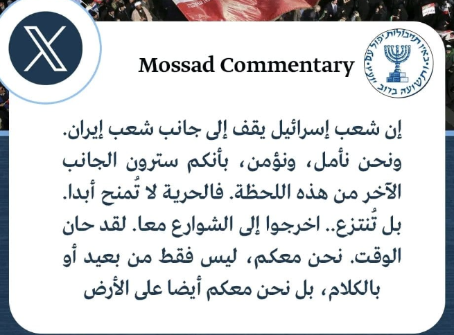 وفي المقابل، جاءت تصريحات إسرائيلية نادرة لتعيد الجدل حول الدور الخارجي في الاحتجاجات الجارية، حيث أدلى “الموساد" الإسرائيلي بتصريح نادر باللغة الفارسية عبر حسابه الرسمي على منصة “إكس”، دعا فيه المتظاهرين الإيرانيين إلى تكثيف حراكهم، مؤكدًا أنه يساندهم “على الأرض”، وليس فقط من بعيد أو بالكلام، وفق تعبيره.