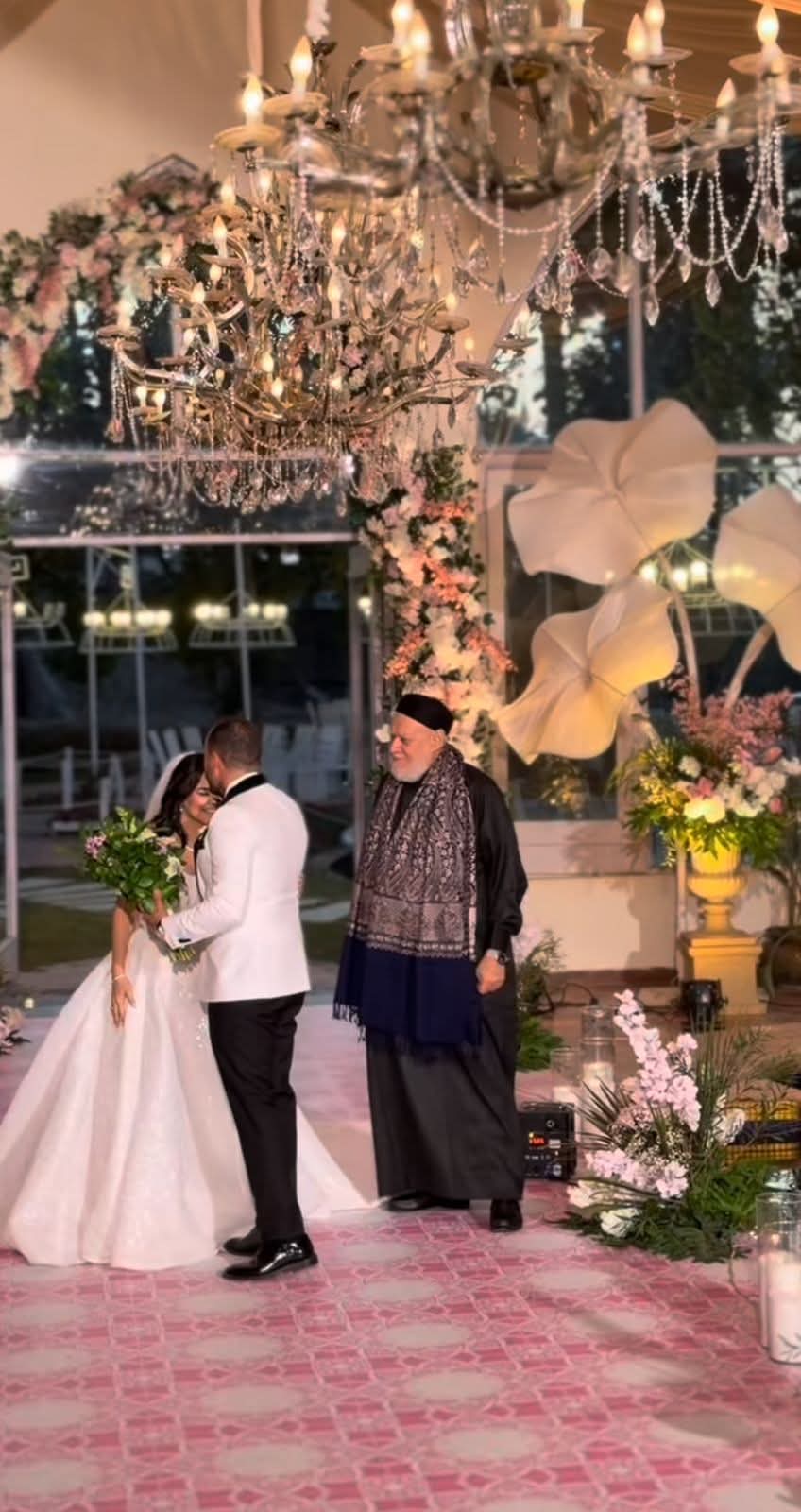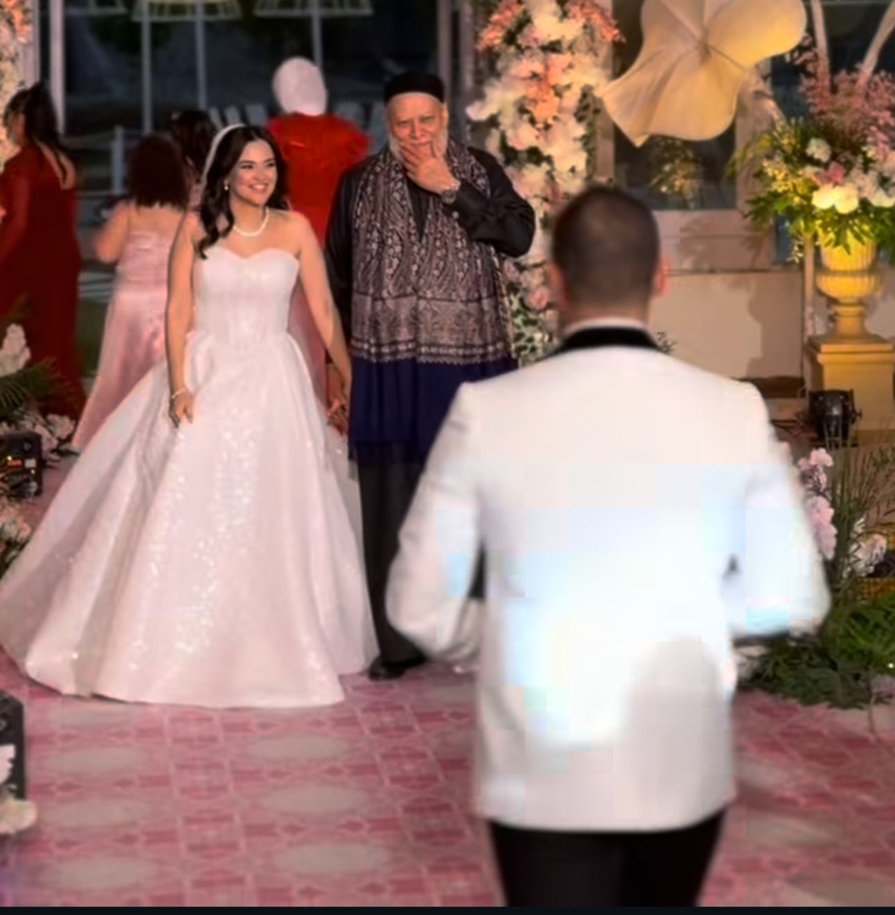 وظهرت العروس مرتدية فستان زفاف أنيق مكشوف الكتفين، مع تسريحة شعر منسدلة وطرحة طويلة، بينما ظهر العريس ببدلة بيضاء. في المقابل، بدا الدكتور علي جمعة بمظهره المعتاد، مرتديًا الجلباب الأسود والعمامة والقفطان.