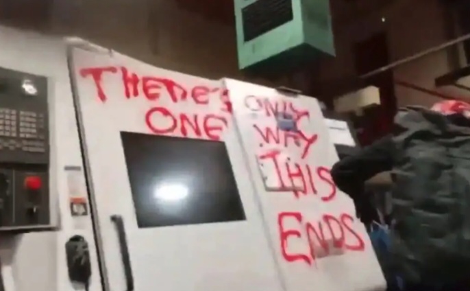 استخدم النشطاء، الذين ارتدوا الكوفية الفلسطينية التقليدية وأخفوا وجوههم، المطارق لتخريب خوادم الكمبيوتر والآلات في المصنع، قبل أن يكتبوا شعارات مثل: "لا يوجد سوى طريقة واحدة لإنهاء هذا الأمر"
