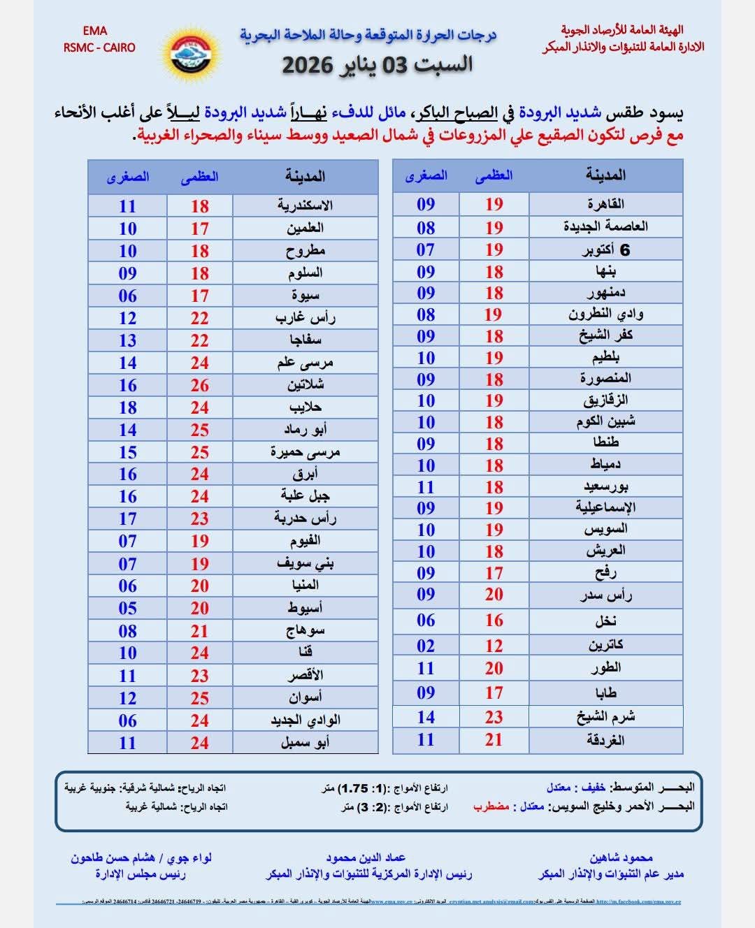 ذكر بيان الهيئة انه يسود طقس بارد على السواحل الشمالية، ومائل للبرودة على وسط سيناء، وبارد على سانت كاترين.