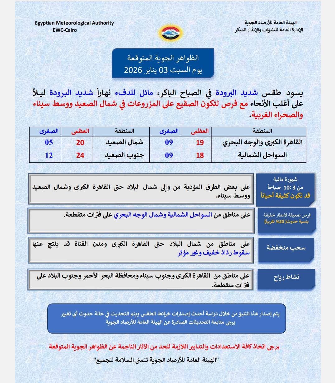 اعتبارًا من الليلة، تشهد درجات الحرارة انخفاضًا ملحوظًا خلال فترات الليل على أغلب الأنحاء، مع فرص لتكوّن الصقيع على المزروعات في وسط سيناء وشمال الصعيد والصحراء الغربية، خاصة خلال الأيام المقبلة.