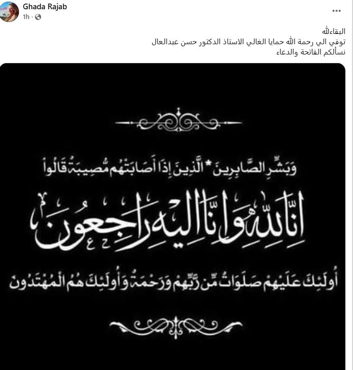 نعت الفنانة غادة رجب حماها الراحل، حيث كتبت عبر حسابها على "فيسبوك": "البقاء لله.. توفي إلى رحمة الله حمايا الغالي الأستاذ الدكتور حسن عبدالعال.. نسألكم الفاتحة والدعاء".