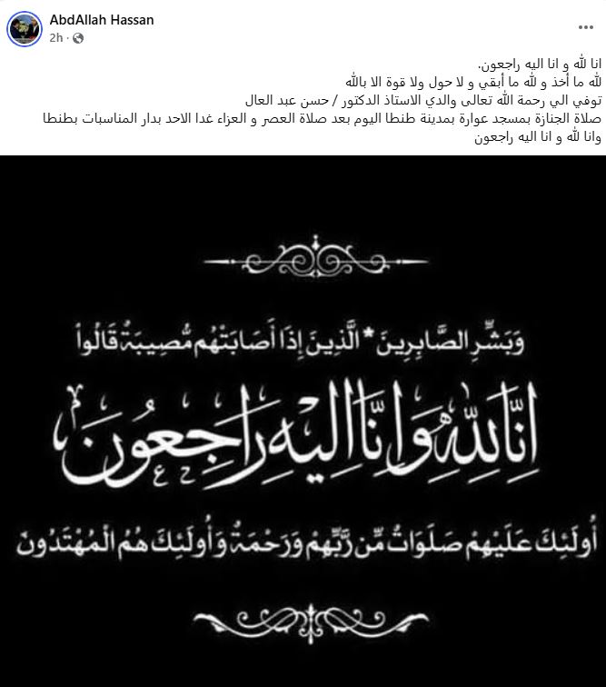 نشر عبدالله حسن، عبر حسابه الشخصي على موقع “فيسبوك”، خبر وفاة والده، حيث كتب: "إنا لله وإنا إليه راجعون.. لله ما أخذ ولله ما أبقى.. ولا حول ولا قوة إلا بالله.. توفي إلى رحمة الله تعالى والدي الأستاذ الدكتور حسن عبدالعال".