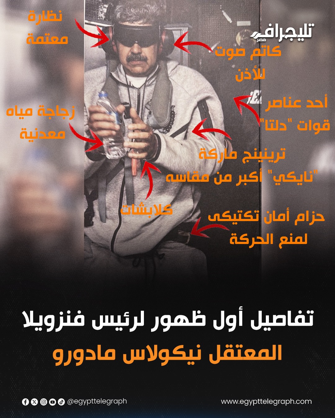 وظهر مادورو مرتديًا ملابس رياضية فضفاضة تبدو أكبر من مقاسه، من ماركة “نايكي” Nike، في مظهر بعيد تمامًا عن الزي الرسمي المعتاد لرؤساء الدول، ما يعكس طبيعة الإجراءات المتبعة خلال عملية النقل.