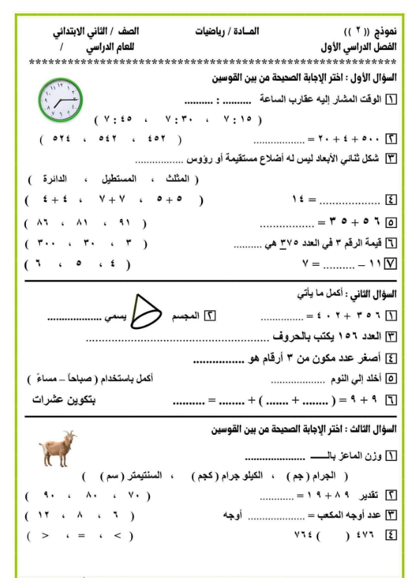 تُعد نماذج امتحان حساب للصف الثاني الابتدائي الترم الأول 2026 وسيلة فعالة لمساعدة التلاميذ على التدريب قبل التقييم النهائي، ويستطيع الطلاب الاطلاع على امتحانات مادة الحساب الصف الثاني الابتدائي من خلال الصور التالية:
