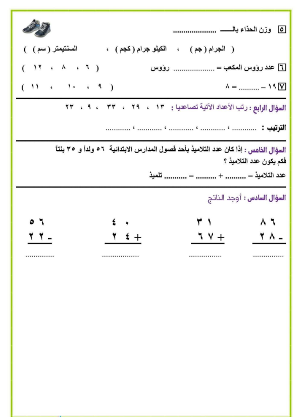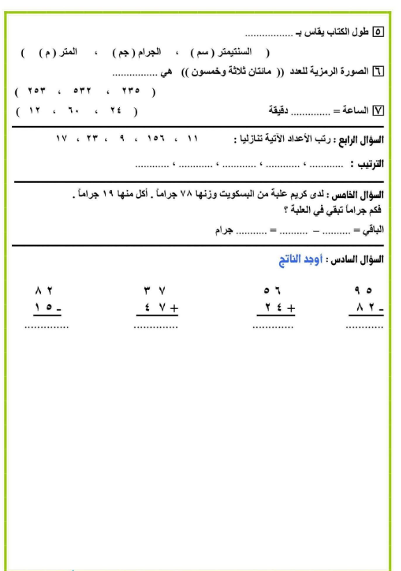 نماذج امتحان حساب للصف الثاني الابتدائي pdf