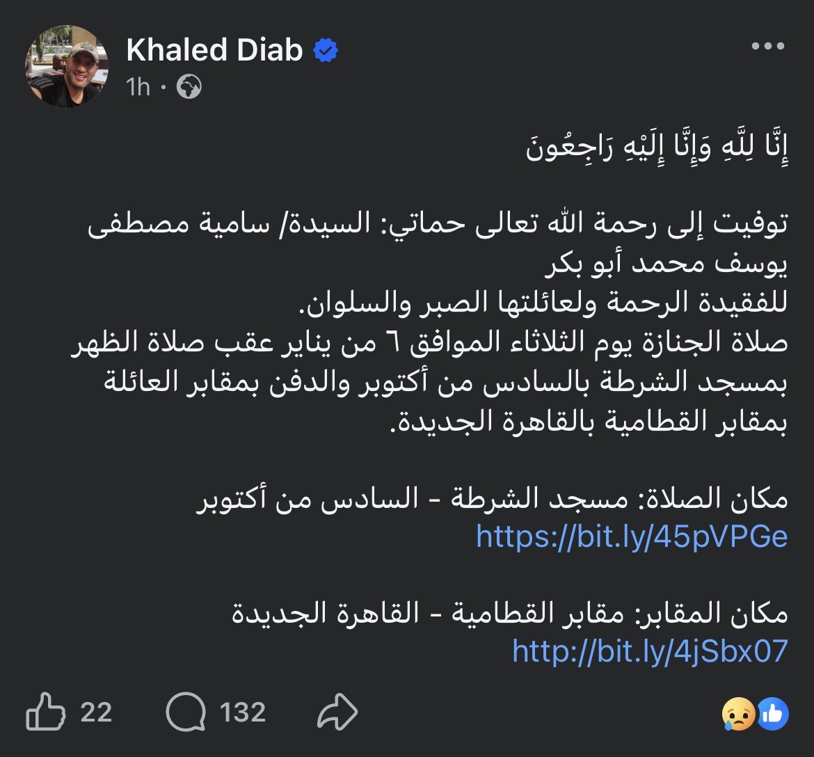 وكتب خالد دياب عبر حسابه الرسمي على موقع التواصل الاجتماعي “فيسبوك”: “إِنَّا لِلَّهِ وَإِنَّا إِلَيْهِ رَاجِعُونَ، توفيت إلى رحمة الله تعالى حماتي السيدة سامية مصطفى يوسف محمد أبو بكر، للفقيدة الرحمة ولعائلتها الصبر والسلوان”.