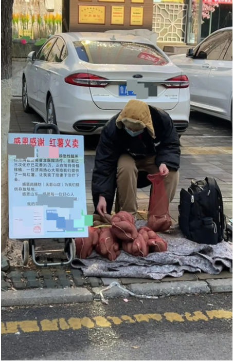 وفقًا لصحيفة “ساوث تشاينا” شوهد جيا تشانجلونج، وهو أب يبلغ من العمر 35 عامًا وهو يبيع البطاطا في مدينة جينان شمال الصين، بعدما وجد نفسه أمام فاتورة طبية تكلف نحو مليوني يوان - 285 ألف دولار- لعلاج زوجته لي من مرض سرطان الدم النخاعي الحاد، بإجراء عملية زراعة نخاع العظم.